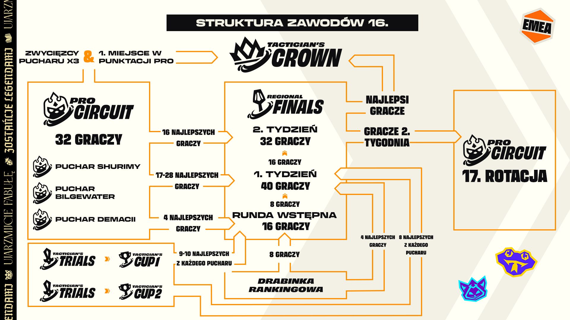 Finały regionalne: 64 najlepszych Taktyków z poprzednich etapów będzie rywalizować przez dwa weekendy, aby wyłonić najlepszych graczy z każdego regionu, ich reprezentantów w Tactician’s Crown oraz określić miejsca w TFT Pro Circuit 17. rotacji.