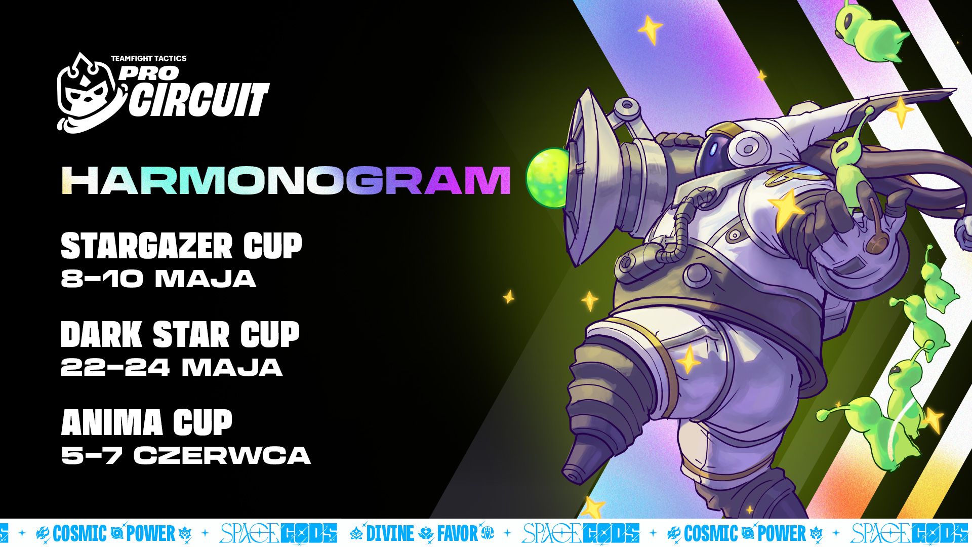 TFT Pro Circuit to ekosystem rozgrywek 1. kategorii, w którym 32 najlepszych graczy z każdego regionu walczy o punkty Pro, pulę nagród wartą 30 tys. dolarów i miejsca w finałach regionalnych. Oto daty 3 pucharów TPC Bogów Kosmosu:
