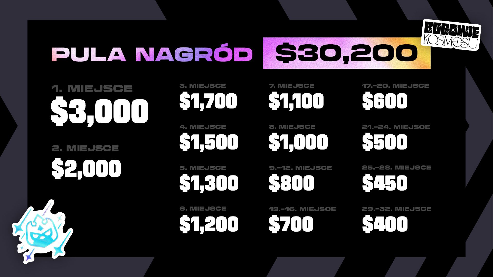 Gracze będą walczyć o pulę nagród o łącznej wartości 30 tys. USD. Zapoznajcie się z zasadami jej podziału poniżej: