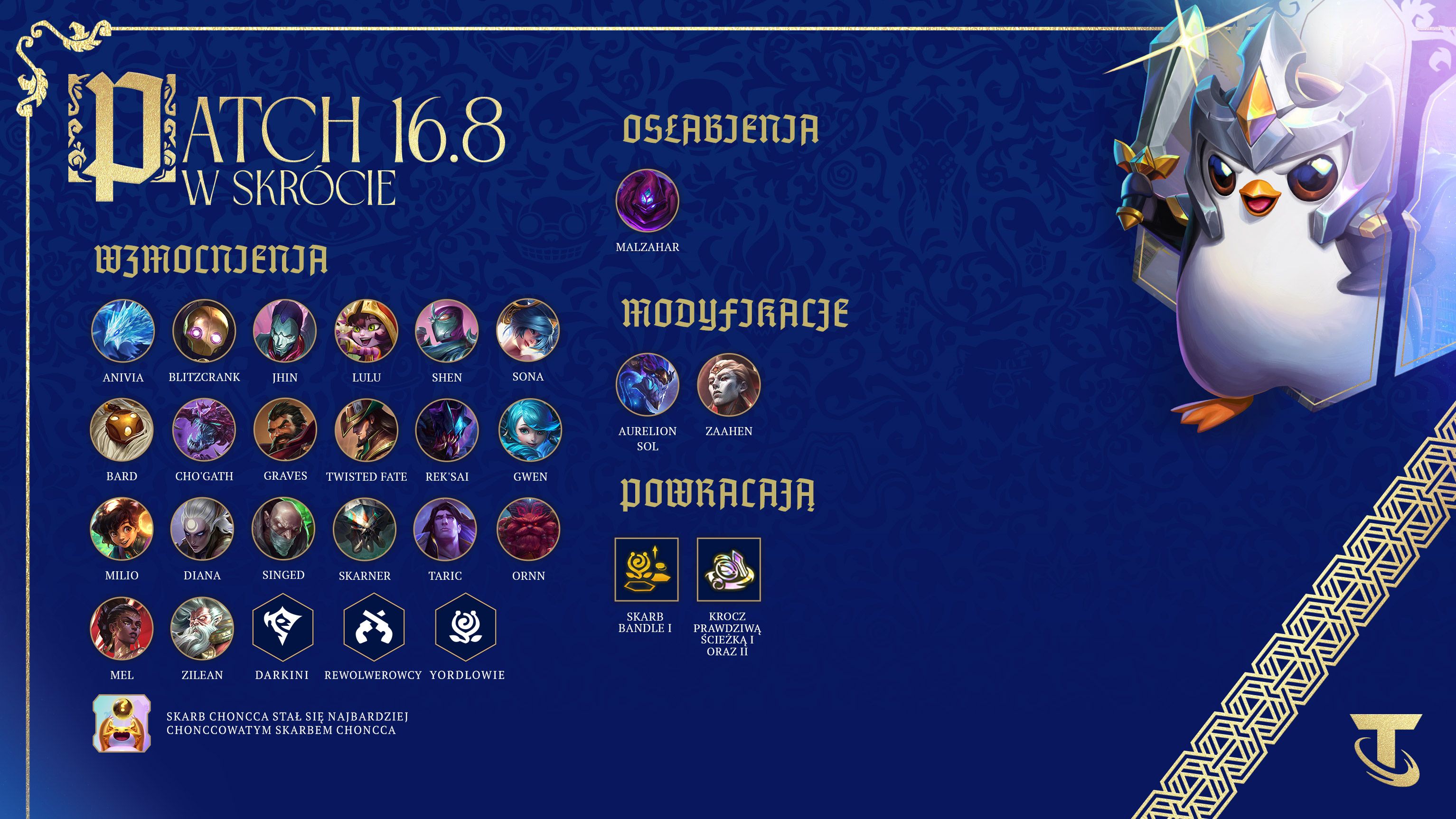 To już ostatni patch, zanim ta rotacja i jej fabuła staną się legendą… Mamy wzmocnienia dla prowadzących, którzy nigdy nie prowadzili (wystarczająco) oraz zgodne z fabułą modyfikacje, a Skarb Choncca staje się jeszcze bardziej chonccowy.