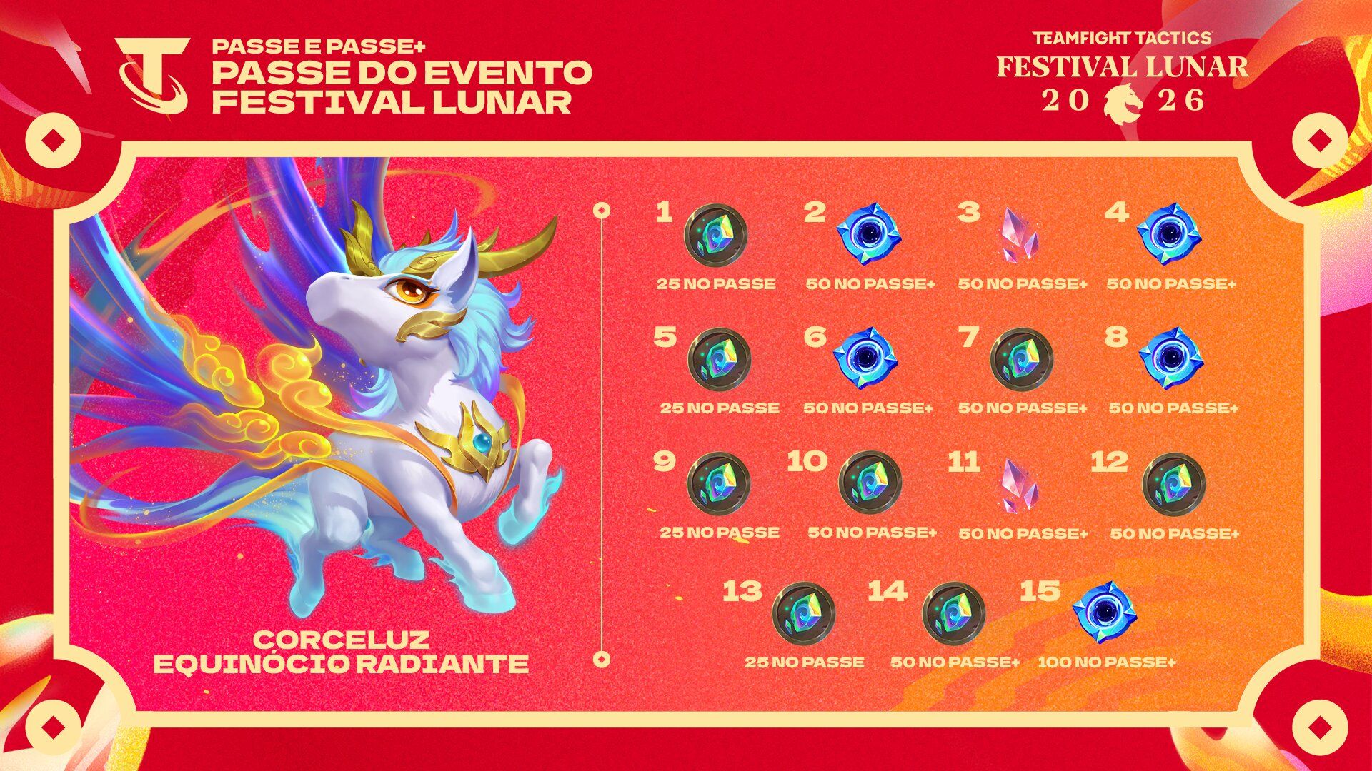 Como nos outros passes, o conteúdo será habilitado à medida que você jogar e coletar EXP. No entanto, esse passe será mais curto em duração e marcos, já que estará ativo apenas durante o evento Festival Lunar, com missões e EXP independentes.