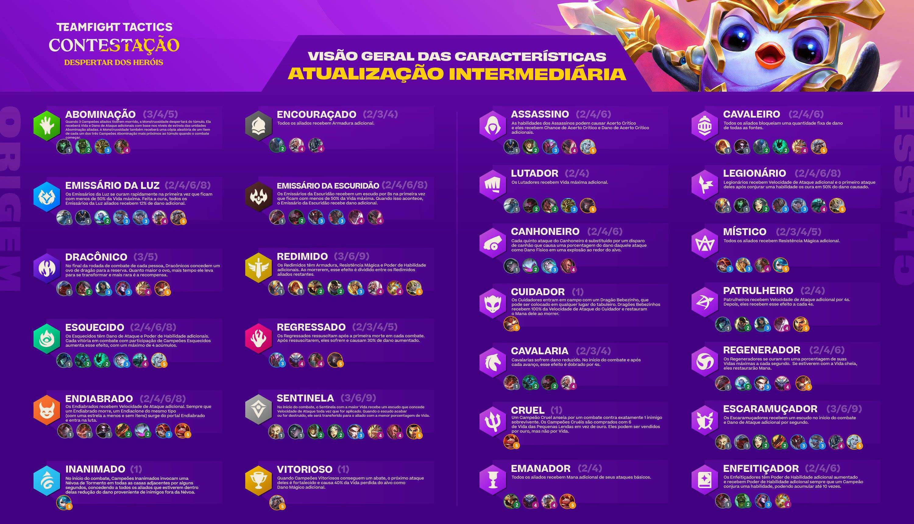 Chegou o momento, galera. Espero que vocês gostem de acordar cedo! Afinal, o Despertar chegou com várias novas características, Campeões e mecânicas para serem aproveitadas! Abracem seus Itens Radiantes preferidos, pois chegou a hora de embarcar em uma nova jornada e colocar um fim nessa Névoa Negra de uma vez por todas! Vocês têm muito o que descobrir com o Despertar dos Heróis, como todas as recompensas que podem ser obtidas com o Passe e o Passe+ Contestação II, todas as novas mecânicas e, claro, todos os novos Campeões e características. E mesmo depois de tanto texto e tanta leitura (vocês mandam bem nisso!), ainda temos mais para compartilhar! Para facilitar as coisas, essa Notas da Atualização servirá como outro resumo, com cosméticos e novidades no topo e alterações e coisas antigas no final.