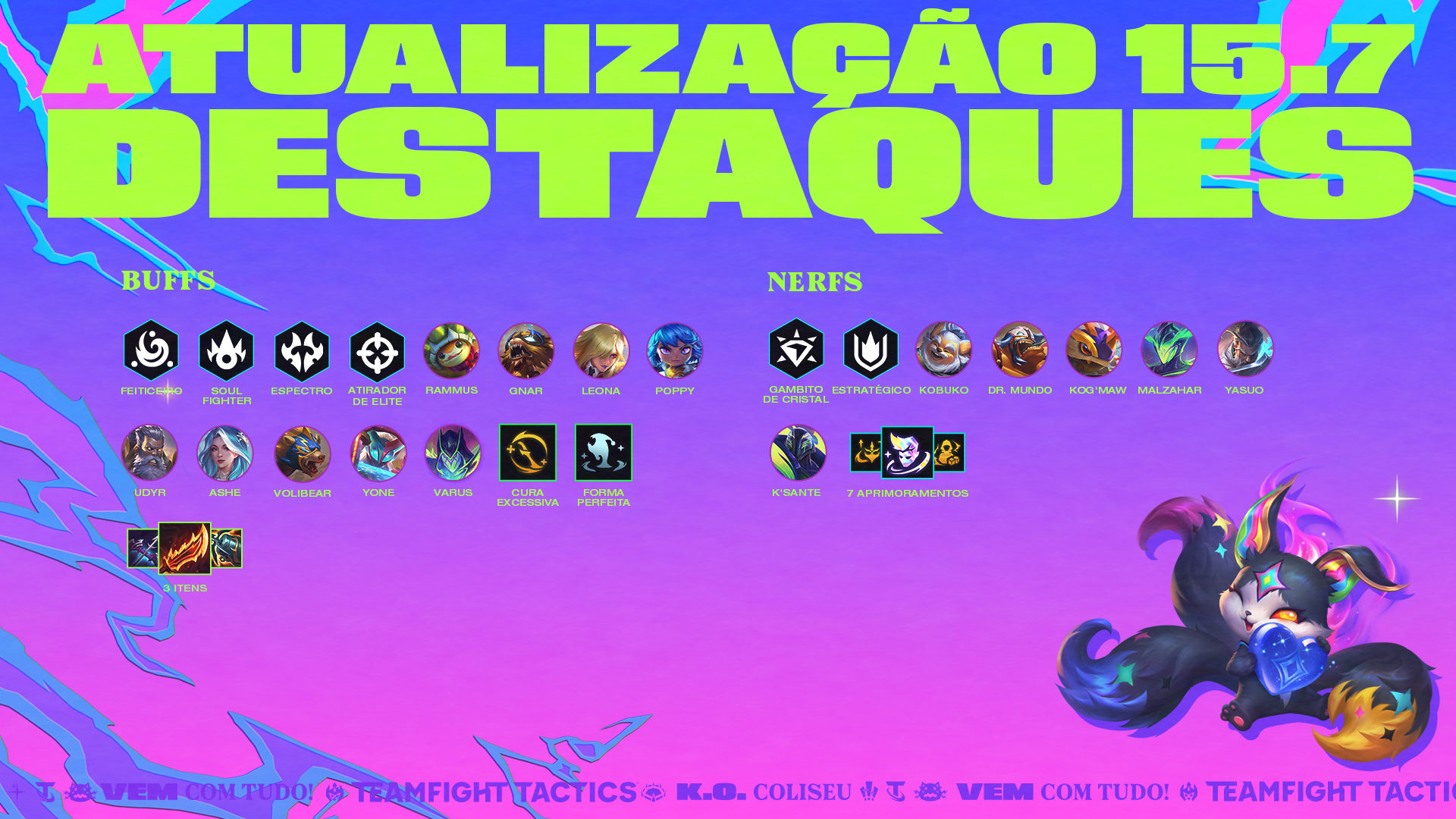A Atualização 15.7 é a antepenúltima do K.O. Coliseu, e a Tactician's Crown será disputada nela no fim de semana de 14 de novembro! E dizem por aí que outra coisa também pode ser anunciada, mas isso foi a Katie que disse, não foi o Rodger, BELEZA?! De qualquer forma, também temos o lançamento do nosso Retorno: Reinos Inexplorados, que ficará disponível algumas horas após a chegada desta atualização.