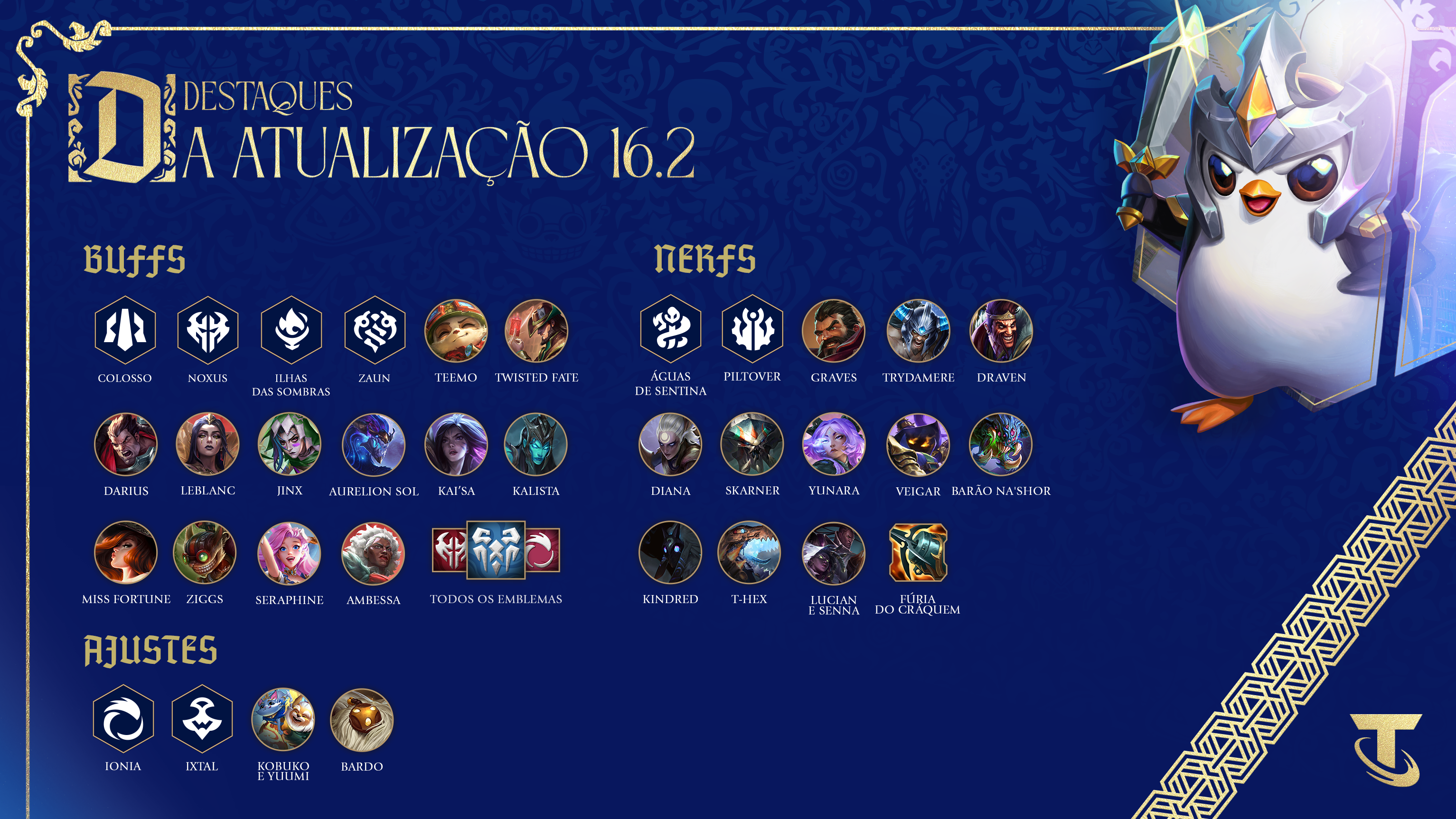 Além de ser a primeira atualização desde a atualização intermediária do ano passado, a 16.2 focará principalmente em reduzir a diferença entre composições de DdA e de PdH, tornar os Emblemas mais viáveis, preservar a força das unidades equipadas e, claro, trazer os balanceamentos de sempre.