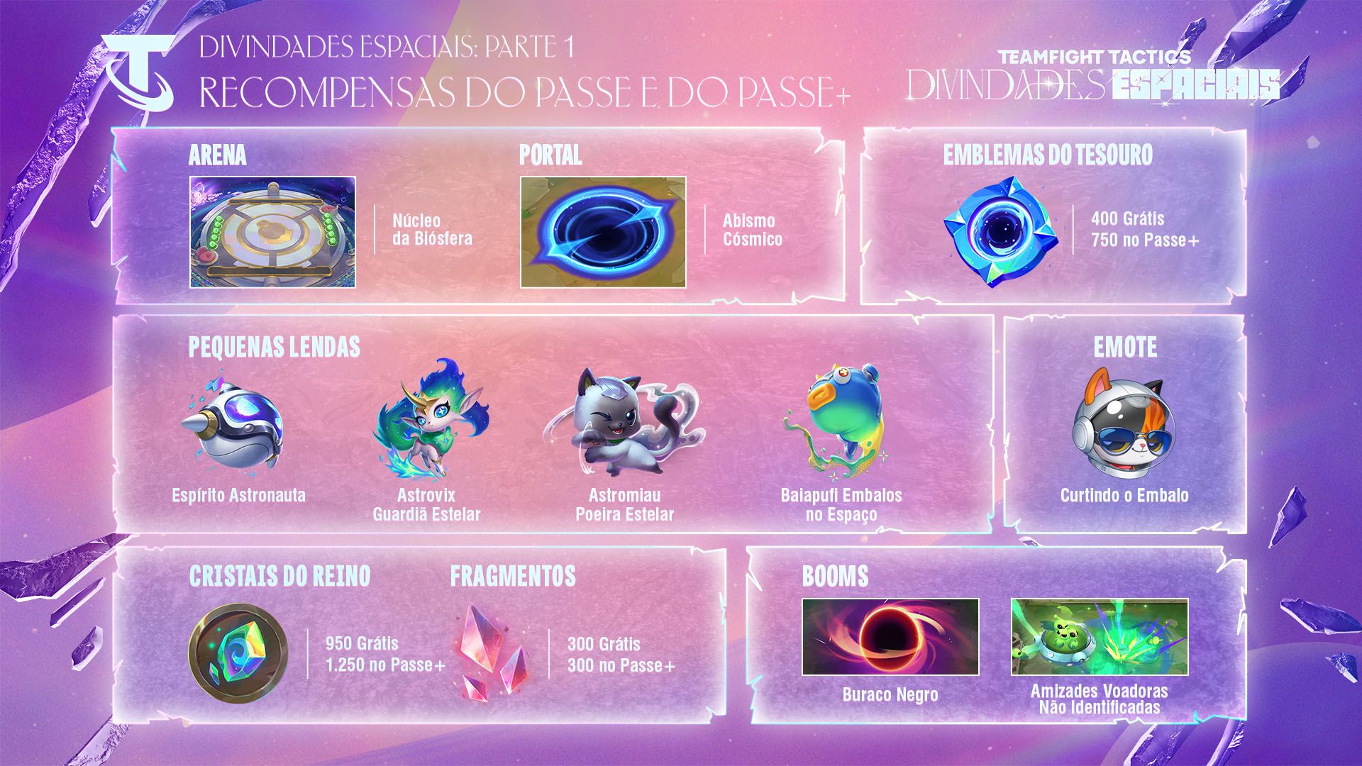 Vamos falar dos sistemas que estão mudando e os que estão retornando, contando com parcerias com terceiros, seu streamer favorito ou sua melhor amizade no TFT para agir em todo o resto. Para ver informações detalhadas sobre a mecânica do conjunto e novas características, confira o artigo Visão geral: Divindades Espaciais.