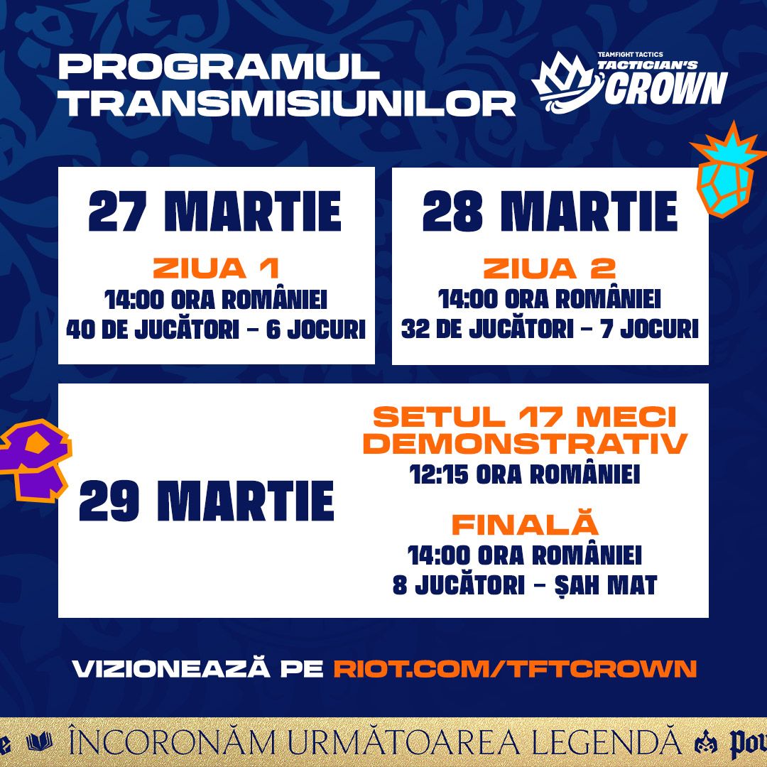 Pășiți în povestea din Povești și legende la Tactician's Crown, care are loc în perioada 27-29 martie, unde cei mai buni 40 de jucători din lume se înfruntă pentru un loc în istoria Runeterrei. De-a lungul unui weekend epic, vor dovedi cine e demn să fie încoronat cel mai bun jucător de TFT din lume.
