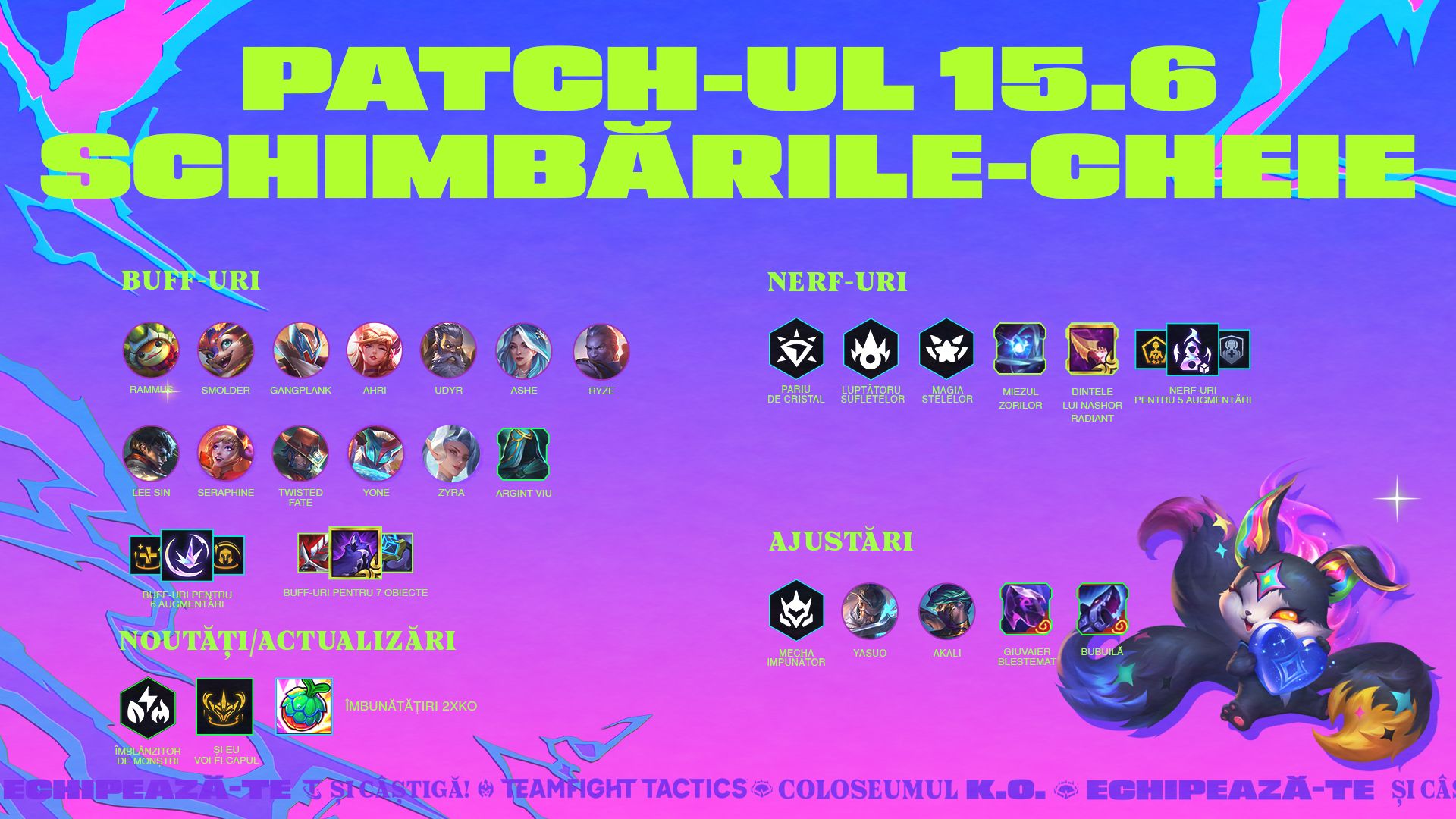 Patch-ul 15.6 aduce buff-uri puternice pentru unitățile de 5 aur, nerf-uri pentru caracteristici și buff-uri pentru câteva unități carry care nu prea cară – dar asta e doar pe partea de echilibrare! În plus, avem noi îmbunătățiri cu tematică 2XKO ce sosesc în Convergență, pentru a sărbători lansarea accesului anticipat la 2XKO! Deci, indiferent că jucați duo în La dublu sau treceți de urcușul abrupt al Ascensiunii lui Ao Shin, spor la treabă! De asemenea, nu uitați să finalizați urcușul cu cele 12 călăuze până la sfârșitul acestui patch pentru a revendica portalul gratuit!