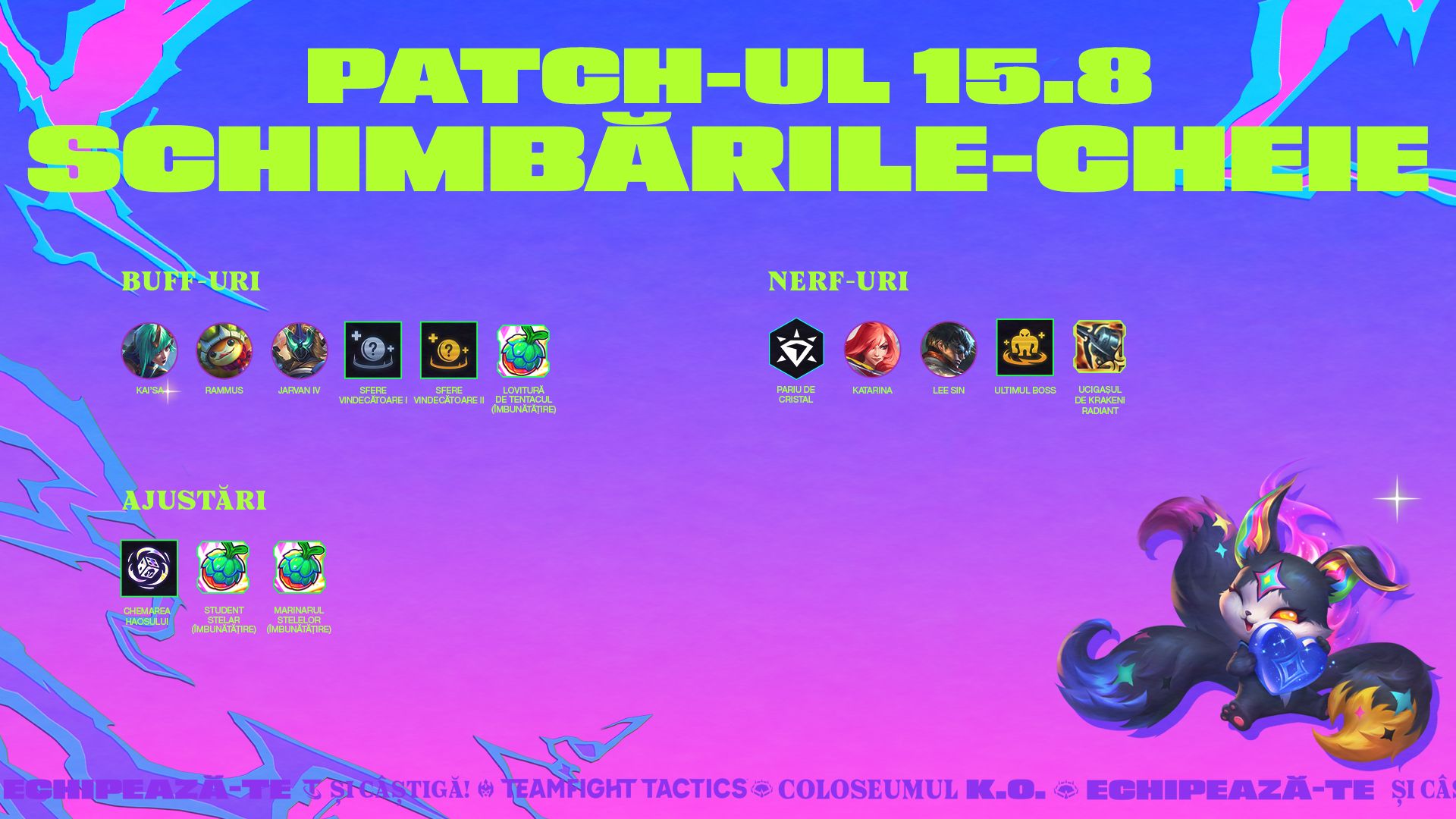 Ultimul patch a fost cel încărcat cu competiții regionale. De data asta, lupta e pe bune; e vremea pentru Tactician's Crown (14-16 nov.). Iar Rodger e atât de încântat ca VOI să vedeți ceea ce am pregătit pe durata acelui eveniment (indiciu: anunț despre noul set?!). Între timp, Katie e încântată că avem un patch plin cu modificări de echilibrare pentru renaștere... primul set în care a ajuns în Master, apropo. Bun, să trecem la ceea ce va fi un patch foarte mic pentru Coloseum și un K.O. pentru Renașterea: Tărâmuri necunoscute!