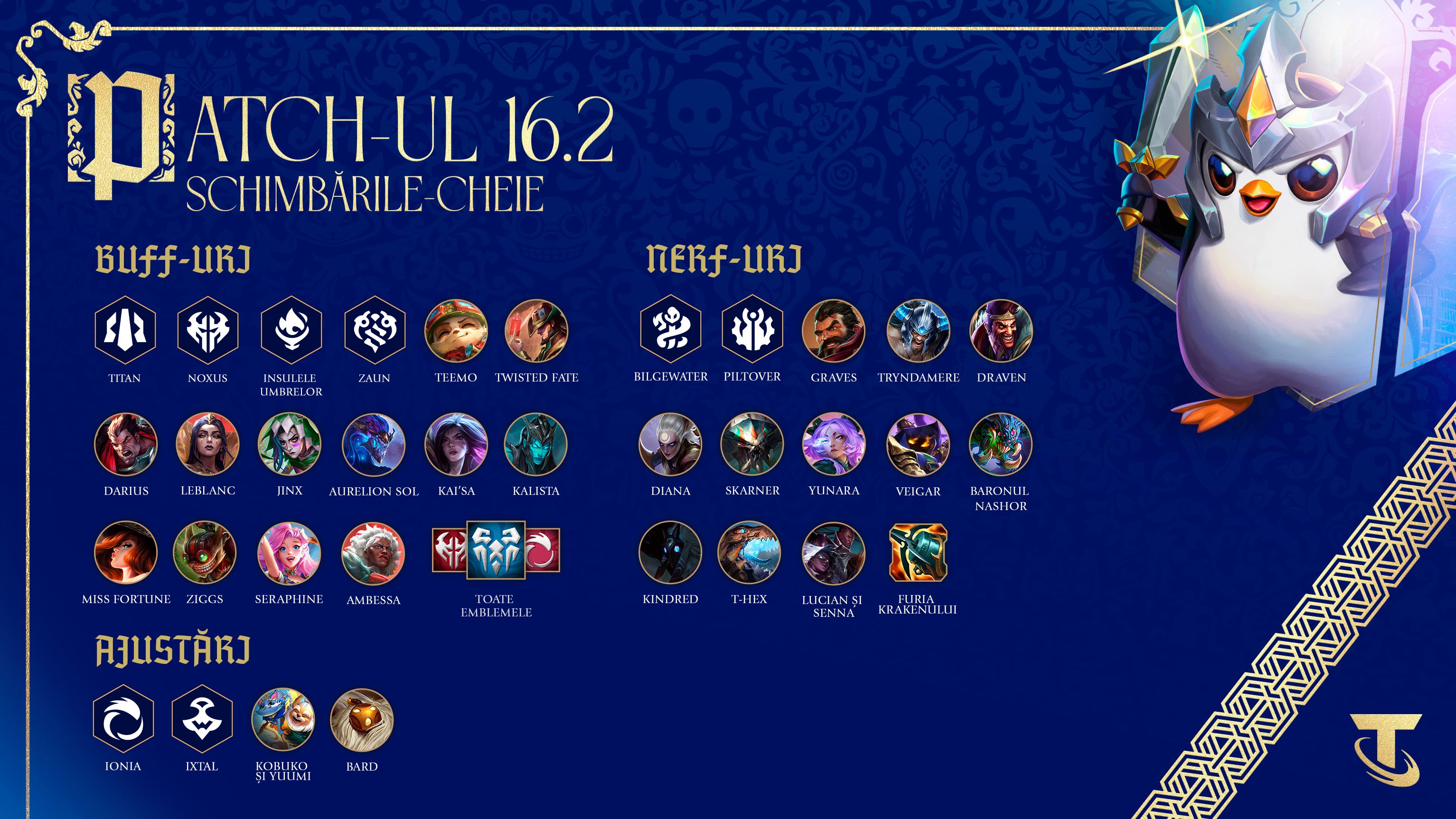 În cele din urmă, știm că sunteți dornici pentru mai multe actualizări legate de ajustări ale condițiilor de deblocare, modificări ale țintirii și altele. În patch-ul 16.2, am avut un interval de timp mai scurt care ne-a permis să reacționăm doar prin ajustări ale valorilor. Avem deja câteva modificări mai importante care să remedieze mai multe îngrijorări cu impact semnificativ asupra designului. Acestea se vor lansa în patch-ul 16.3. Deocamdată, la mulți ani și nu uitați: consecvența e cheia rezoluțiilor de Anul Nou, iar antrenamentele alături de Sett vă vor face mai mari (sau vă vor crește viteza de atac).
