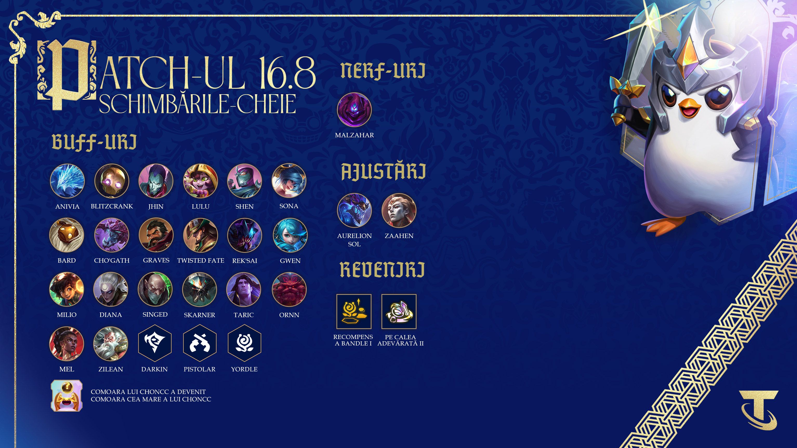 Este ultimul nostru patch înainte ca acest set să devină legendă și poveste... Avem buff-uri pentru carry-uri care nu au reușit niciodată să care (destul) și ajustări fidele poveștii pentru live, iar Comoara lui Choncc devine și mai mare, așa ca el.