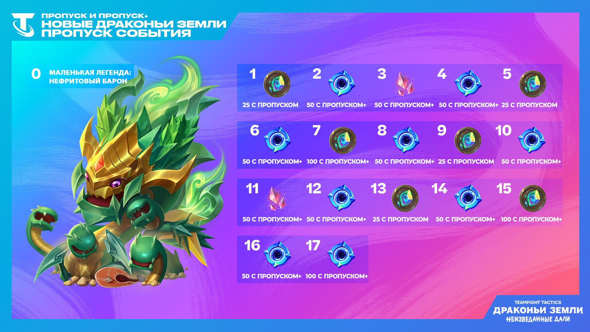 Пропуск+ "Возвращение набора" включает в себя 500 жетонов сокровищ, 200 кристаллов царства, 100 осколков звезд и эксклюзивную маленькую легенду, Нефритового Барона. Этот пропуск можно приобрести за 975 RP уже сегодня!