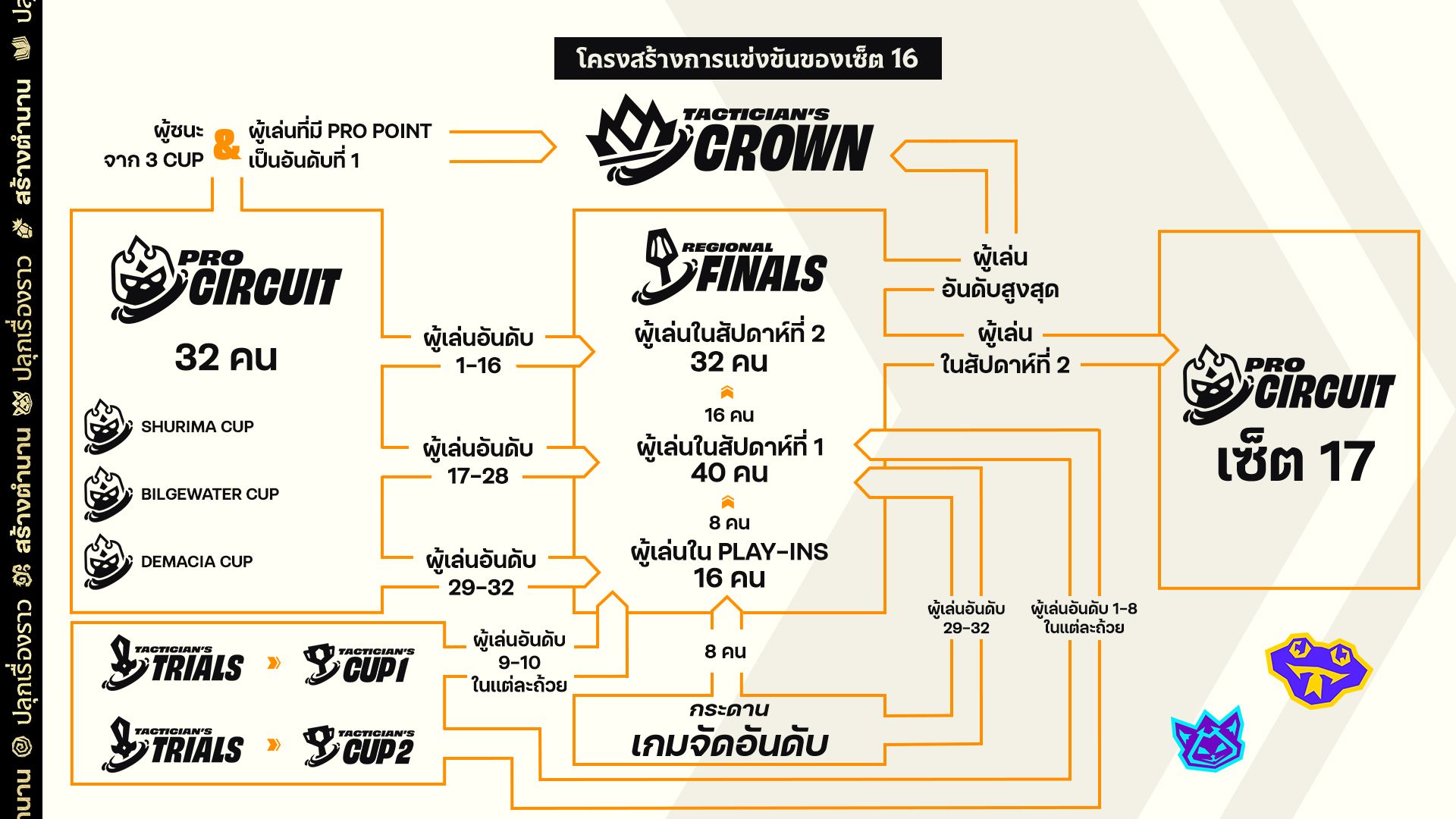 TFT Pro Circuit: ผู้เล่น 32 อันดับแรกจากเซ็ตก่อนหน้านี้จะมาแข่งขันกันในทัวร์นาเมนต์ระดับสูงแบบปิด สามสุดสัปดาห์แห่งการแข่งขันจะเป็นตัวตัดสินผู้ผ่านเข้ารอบโดยตรงสู่ Tactician’s Crown ในขณะที่ผู้เล่นคนอื่น ๆ อาจผ่านเข้ารอบสู่ Regional Finals ในสัปดาห์ที่ 1 หรือ 2 ตามผลงาน