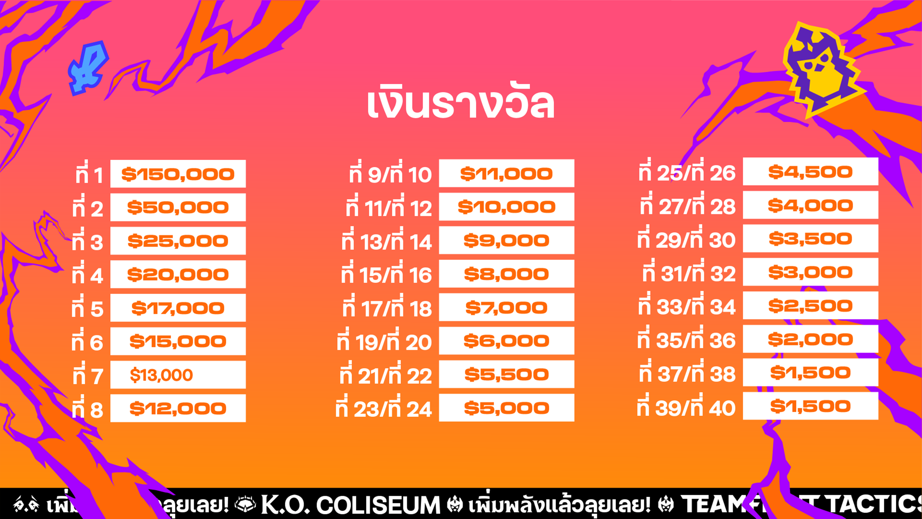 ผู้เล่นจะมาต่อสู้กันเพื่อแย่งชิงส่วนแบ่งจากเงินรางวัลรวม 470,000 ดอลลาร์สหรัฐฯ ดูรายละเอียดได้ด้านล่างเลย: