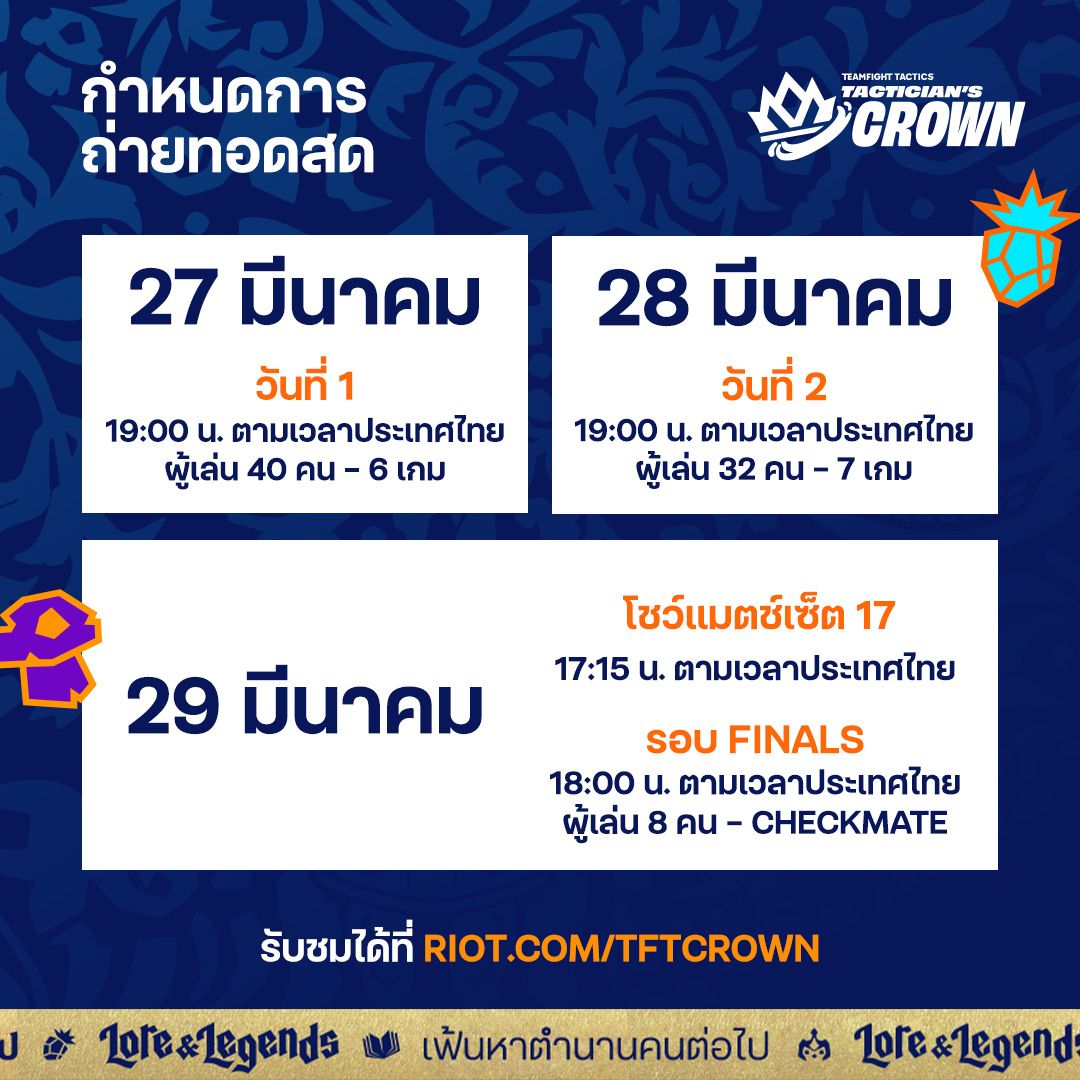 ก้าวเข้าสู่เรื่องราวของ Lore & Legends ในอีเวนต์ Tactician’s Crown ซึ่งจะจัดขึ้นในวันที่ 27–29 มีนาคม โดย 40 ผู้เล่นตัวท็อปของโลกจะมาประชันฝีมือกัน เพื่อจารึกชื่อไว้ในประวัติศาสตร์ของ Runeterra ตลอดช่วงวันหยุดสุดสัปดาห์ที่จะกลายเป็นตำนาน พวกเขาจะพิสูจน์ให้โลกได้รู้ ว่าใครที่คู่ควรจะได้รับตำแหน่งผู้เล่น TFT ที่เก่งที่สุดในโลกไปครอง