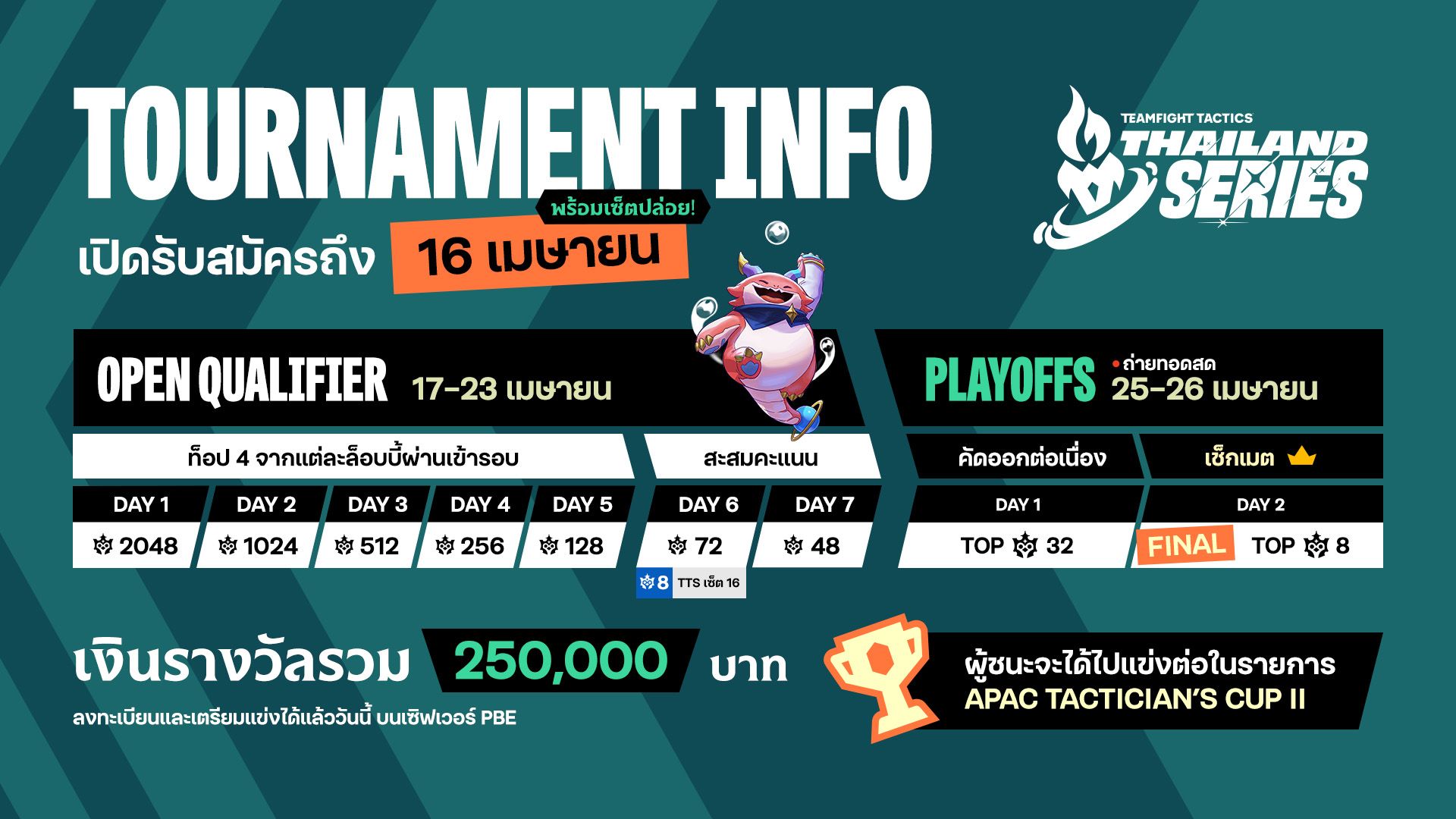 แชมป์ในทัวร์นาเมนต์นี้ยังจะได้รับสิทธิ์เป็นตัวแทนประเทศไทยไปแข่งขันต่อในรายการ APAC Tactician’s Cup II อีกด้วย สมัครได้แล้ววันนี้ทาง discord.gg/thailandtftesports และสามารถอ่านกฎการแข่งขันเพิ่มเติมได้ทาง riot.com/TTS-set17rulebook