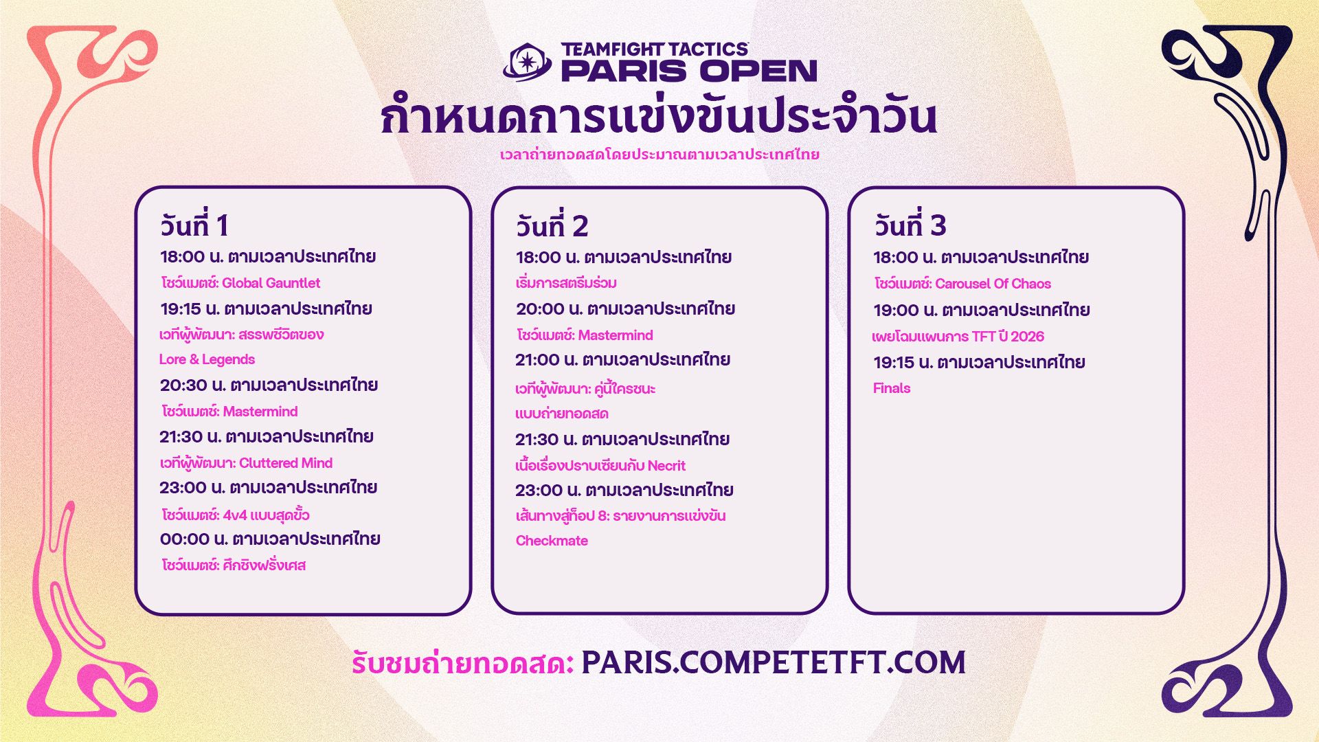 อย่าลืมแวะมารับชมในวันที่ 12-14 ธันวาคม เพื่อติดตามการแข่งขัน TFT Paris Open! รายละเอียดเพิ่มเติมเกี่ยวกับกำหนดการสามารถดูได้ที่ด้านล่างเลย