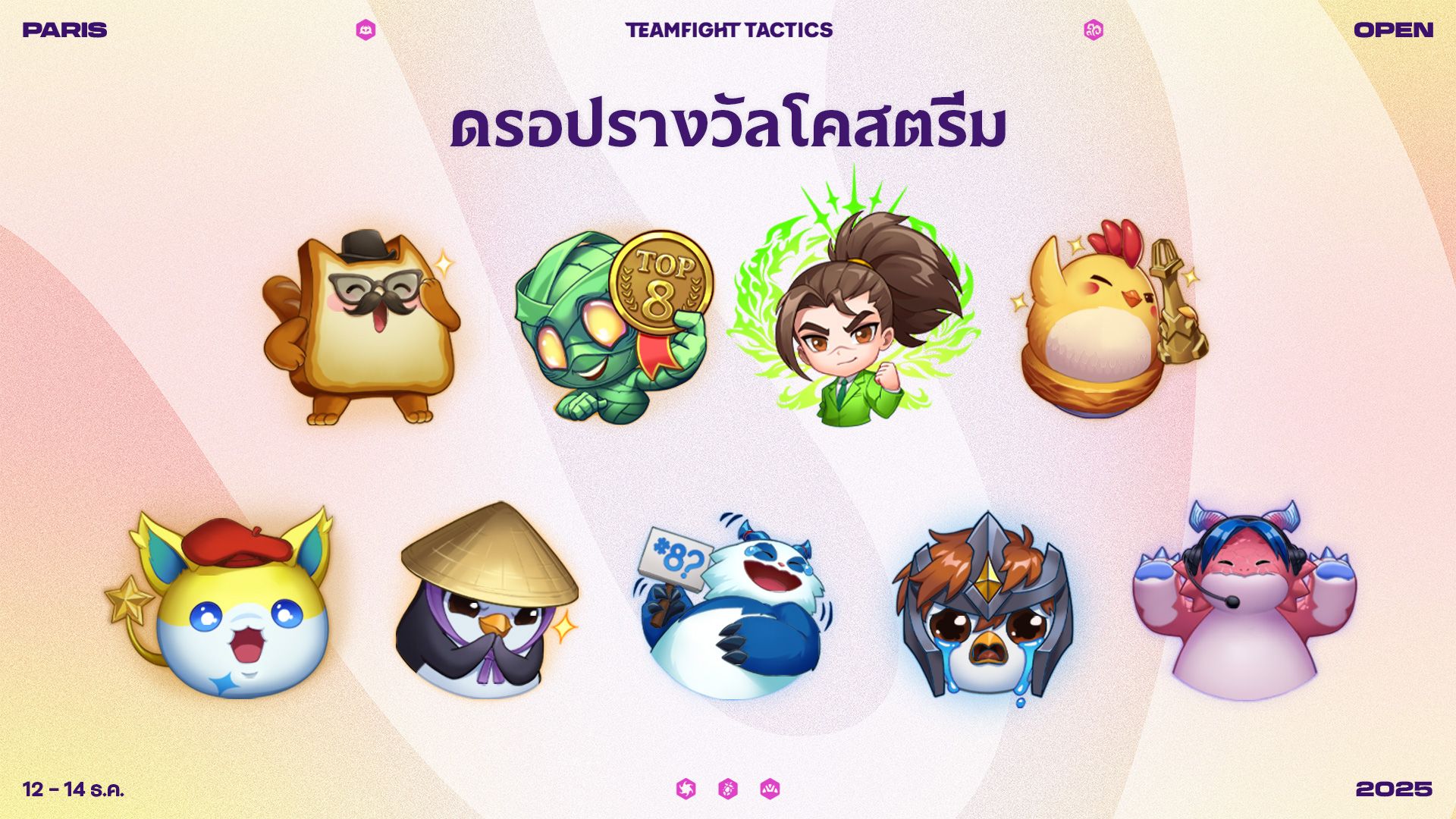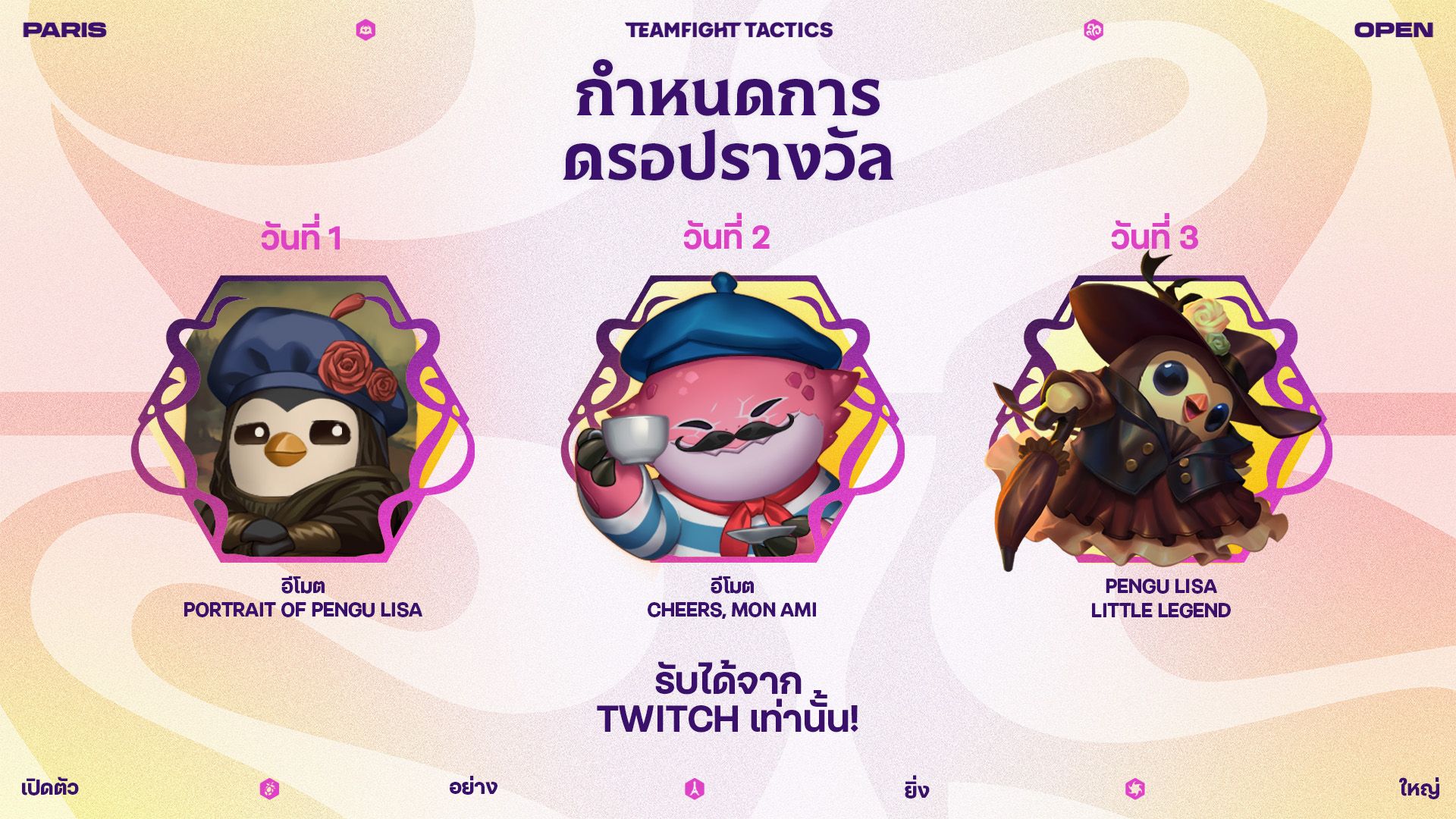 ดรอปรางวัลกลับมาอีกครั้งเพื่อมอบให้กับแฟน ๆ ทุกคนที่ร่วมรับชม TFT Paris Open! โดยเราจะมีดรอปในทั้งสามวันของการแข่งขัน ดังนั้นอย่าลืมรับชมผ่าน Twitch หรือ YouTube เพื่อโอกาสได้รับรางวัลไปครอง แค่เช็กให้มั่นใจว่า Riot ID ของคุณเชื่อมต่อกับบัญชี Twitch หรือ YouTube แล้วก็พอ