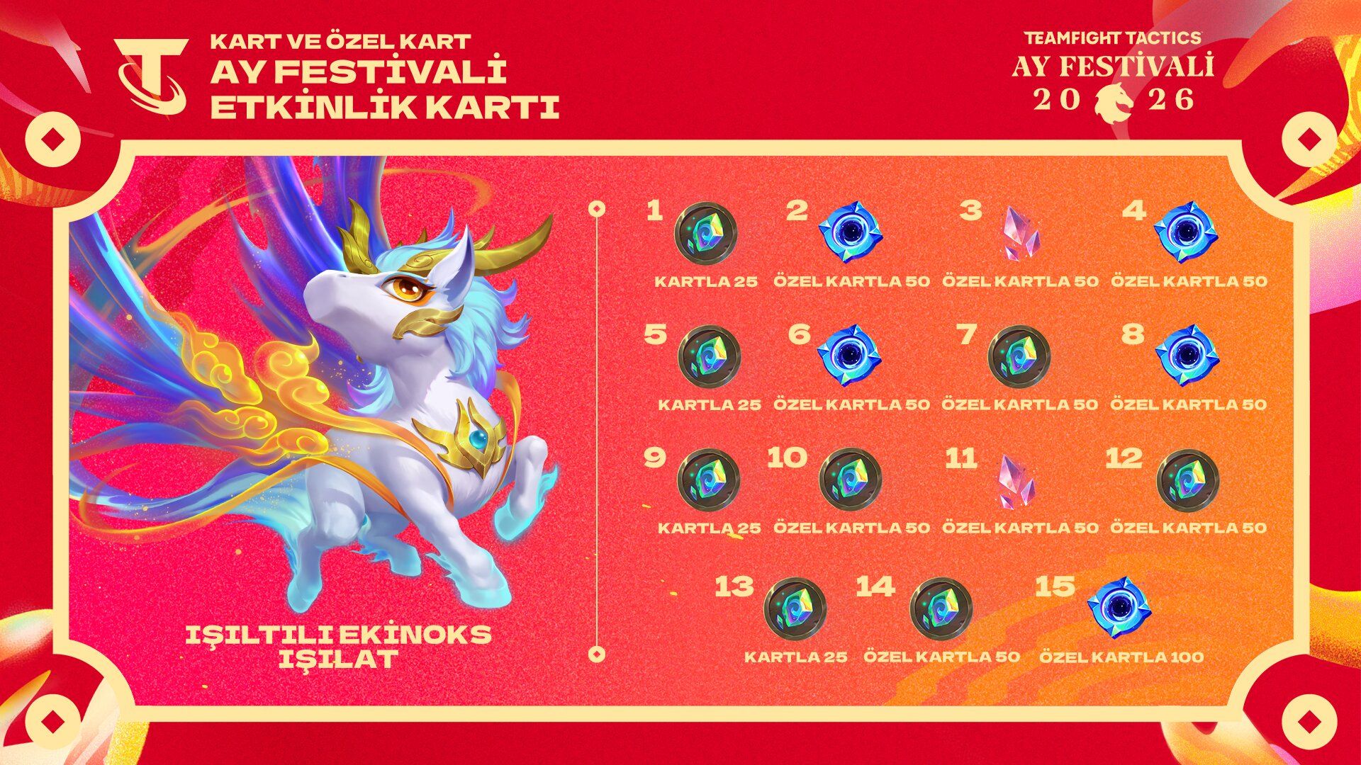 575 RP karşılığında alabileceğiniz Ay Festivali Kartı'nda diyar kristalleri, hazine sembolleri ve bu karta özel olup Dönüşümlü Mağaza'da yer almayacak Işıltılı Ekinoks Işılat bulunuyor.