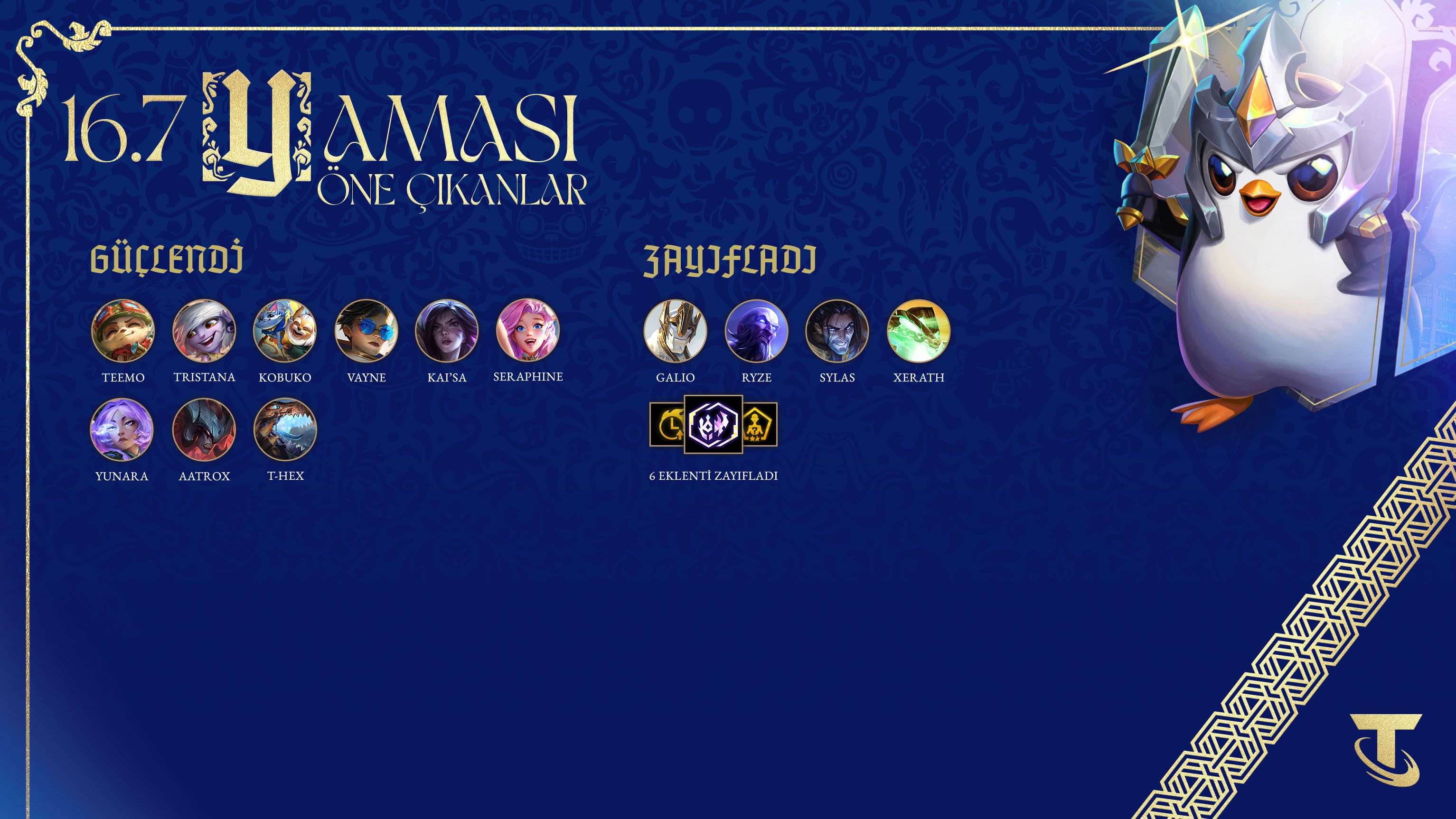 16.7 Yaması, 16.6'da açılabilir şampiyon sistemine getirdiğimiz büyük değişiklikleri takip eden daha küçük bir yama. 16.6 Yaması'yla kurulan dengeden memnunuz. Bu yüzden ve 16.7'nin Tactician's Crown yaması olmasından ötürü daha küçük, daha güvenli ve hedefe odaklanan değişiklikler uyguluyoruz.