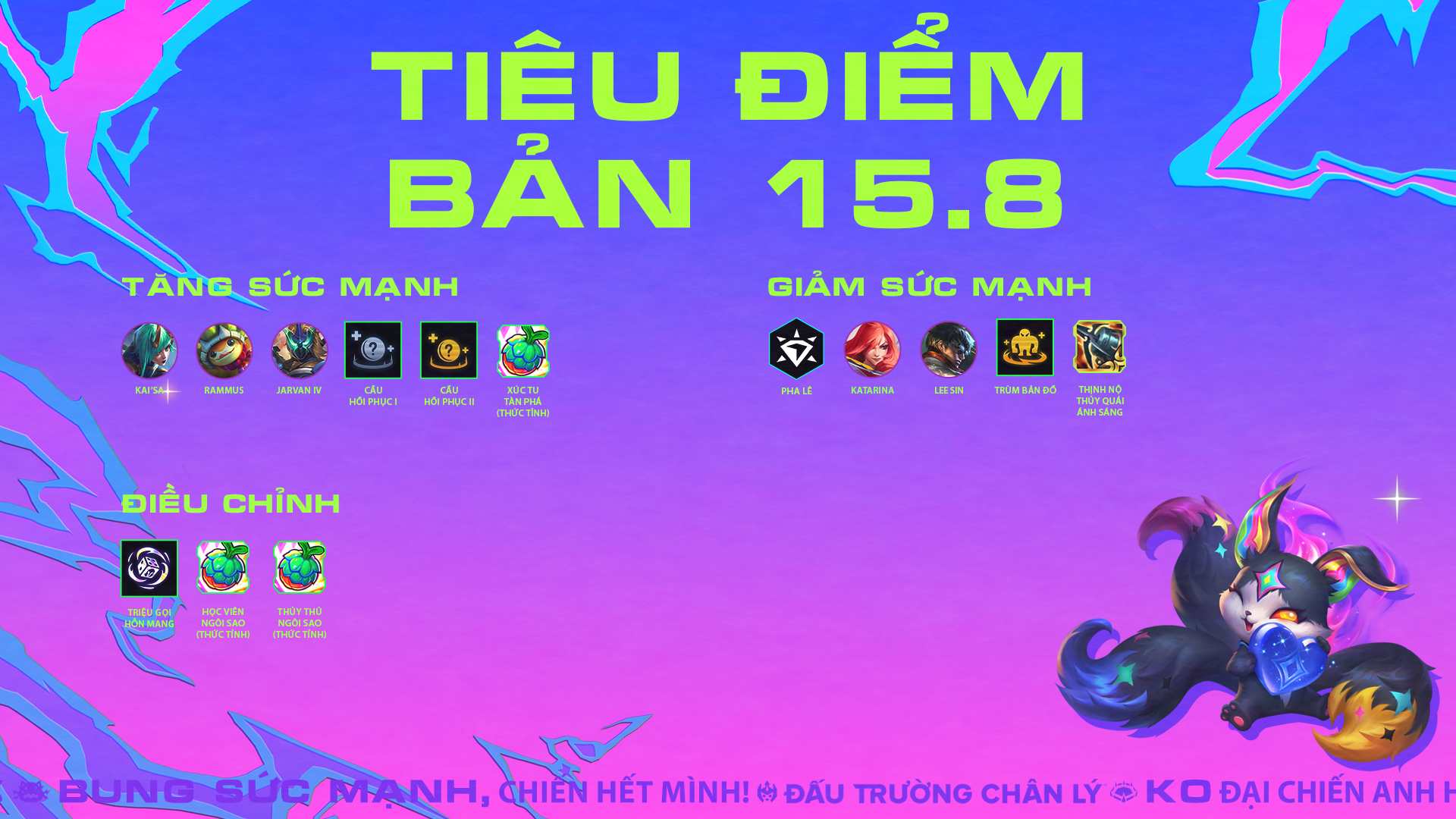 Phiên bản gần nhất là phiên bản tập trung vào giải đấu Khu Vực. Lần này sẽ là thứ thiệt; đã đến lúc hướng về Tactician's Crown (14/11 - 16/11). Và Rodger đang cực kỳ háo hức để cho BẠN biết chúng tôi đã chuẩn bị những gì cho sự kiện đó (gợi ý: thông báo về mùa mới!?) Cùng lúc đó, Katie cũng rất phấn khởi vì chúng ta sẽ có một phiên bản đầy những thay đổi cân bằng cho Mùa Tái Hiện, cũng là mùa đầu tiên mà cô ấy lên được Cao Thủ. Được rồi, hãy cùng bắt đầu với một phiên bản khá nhẹ nhàng cho K.O. và đầy thay đổi cho Tái Hiện: Vùng Nguyên Sinh!