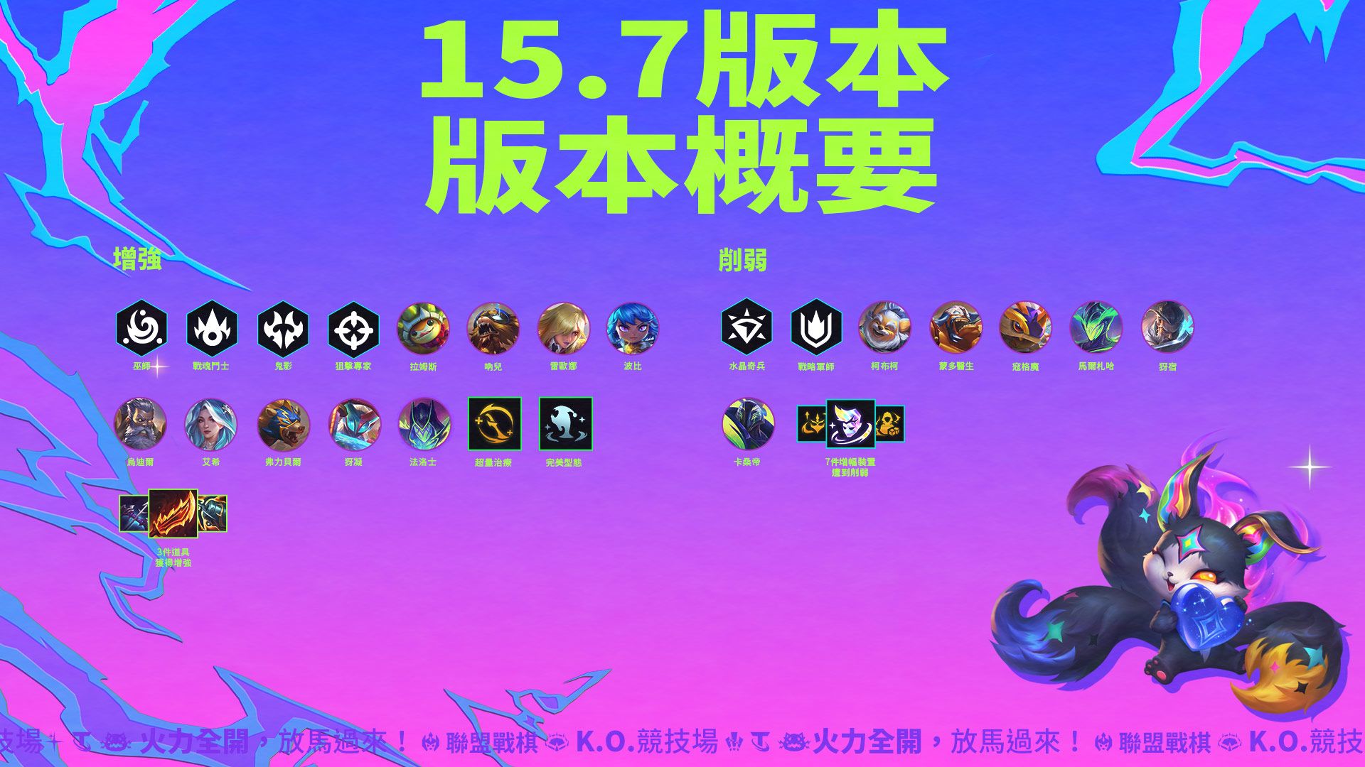 15.7版本是「K.O.競技場」倒數第三次更新,同時也是「Tactician's Crown」比賽的版本,該賽事將於11月14日週末舉行!據說當週還會有其他驚喜公布。如果別人問你是哪聽說的,你要說是Katie講的,不可以說是Rodger,打勾勾喔!此外,「棋組回歸:玄幻秘境」也將在本次更新後數小時正式上線。